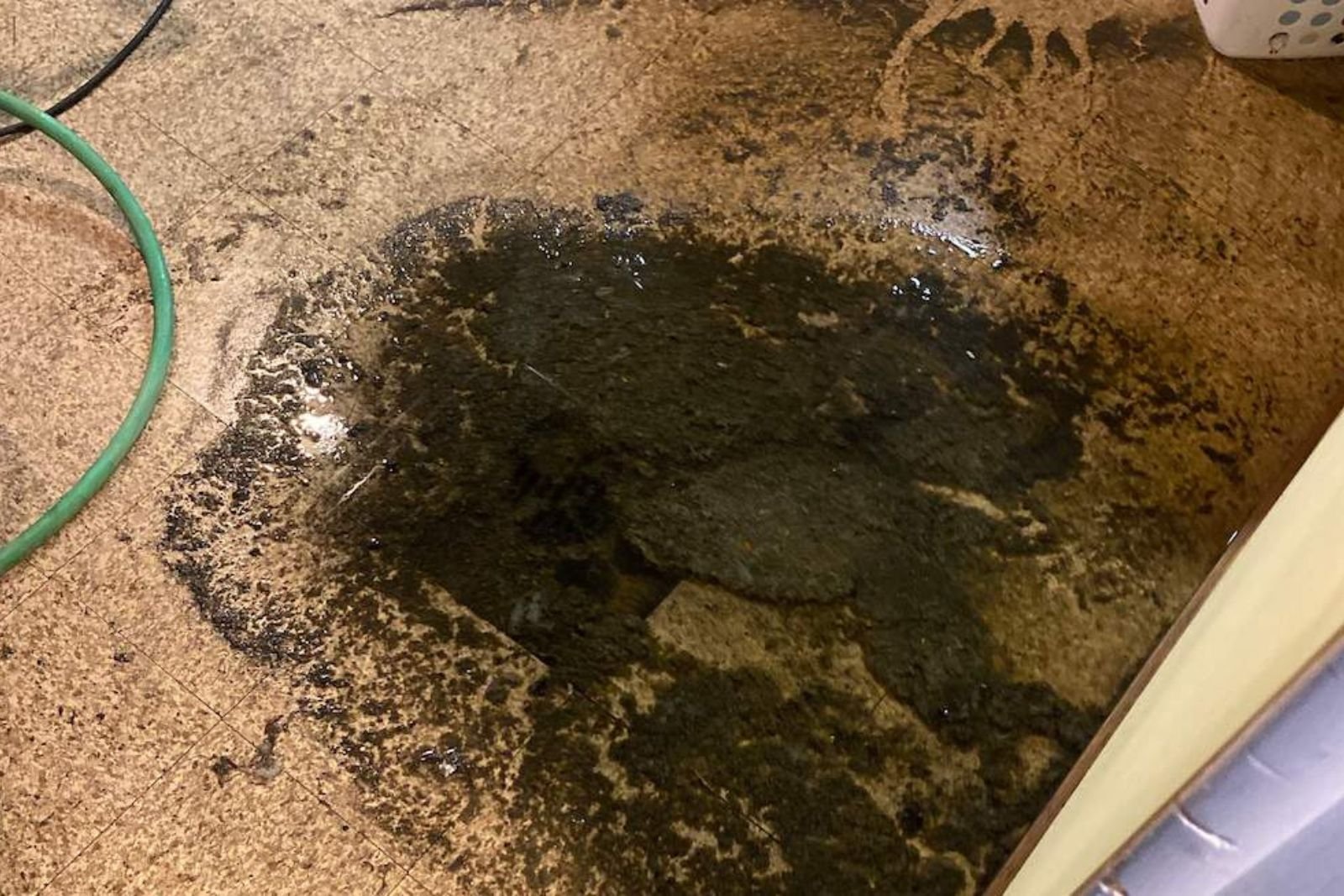 This water has some chemicals or dirt. It often comes from a washing machine or a dishwasher that overflowed recently.